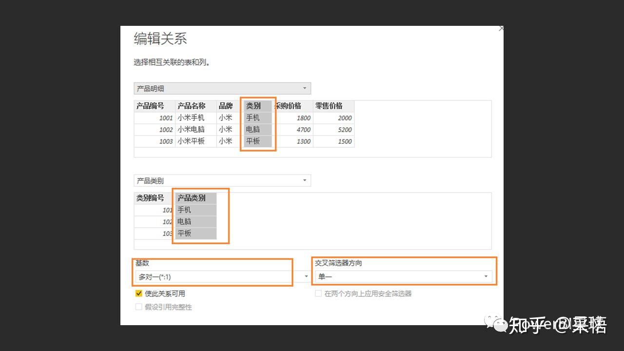 编辑关系窗口可以看出关联的两个表和对应的字段,也可以更改联结的字段;下面还有两个可选项,基数和交叉筛选方向。