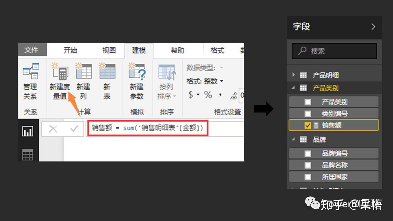在销售明细表中并不能直接统计出按品牌的销售额,可以先建一个度量值,在建模选项卡下,点击新建度量值,公式栏输入: