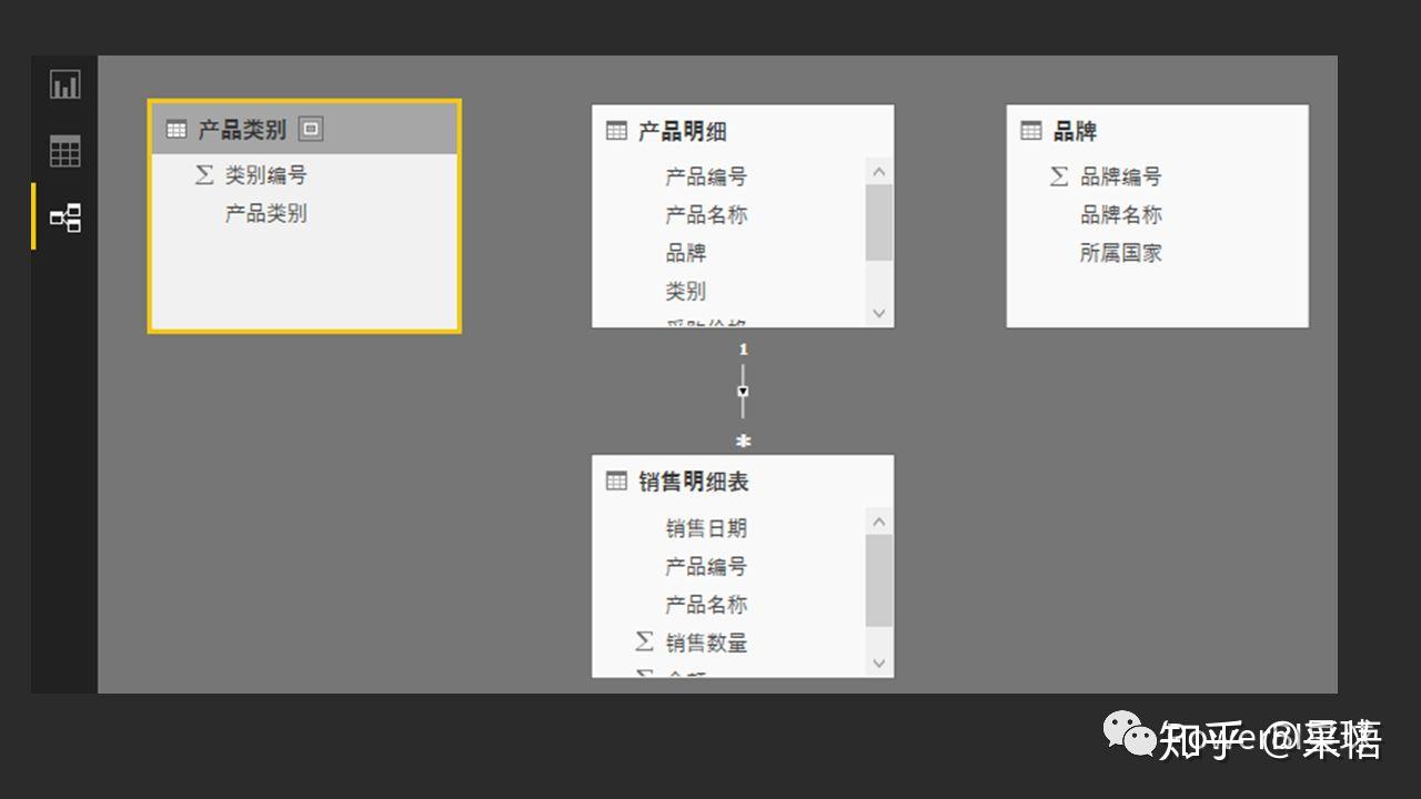 可以看出产品明细表和销售明细表之间已经有一条线,这是由于表格导入后,PowerBI会自动检测关系并联接,没有检测到的表,可以点击一个表中的字段托到另一个表的对应字段上,就可以建立关系了,把类别表、品牌表和产品明细表建立关系后,关系图如下: