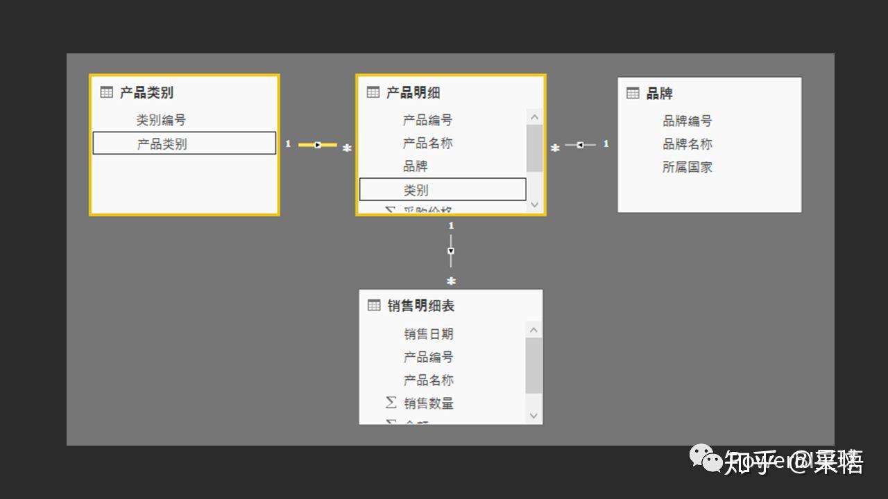 具有唯一值的表通常称为“查找表”,而具有多个值的表称为“引用表”。在上述的关系图上,产品明细表上类别手机、平板、电脑都不是唯一的,每个品牌都有这种类型,是个引用表;但类别表上,几种类别都是唯一值,因此这两个表是多对一的关系,类别表也就是查找表。