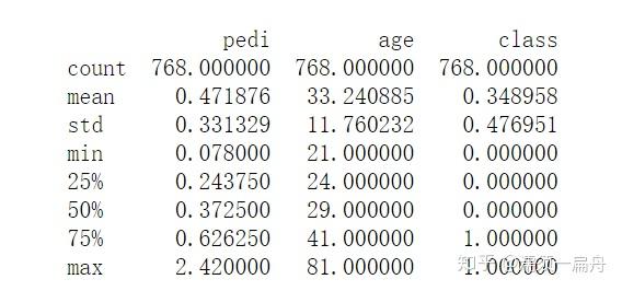 # Load CSV using Pandas from URL import pandas # 导入pandas库 url = "https://raw.githubusercontent.com/jbrownlee/Datasets/master/pima-indians-diabetes.data.csv" names = [\'preg\', \'plas\', \'pres\', \'skin\', \'test\', \'mass\', \'pedi\', \'age\', \'class\'] data = pandas.read_csv(url, names=names) # 读取数据 head_5 = data.head(5) # 查看前5行 print(head_5) tail_5 = data.tail(5) # 查看后5行 print(tail_5) shape_ = data.shape # 查看数据规格,即多少行多少列 print(shape) dtypes_ = data.dtypes # 查看每个变量的数据类型 print(dtypes_) corr_ = data.corr() # 查看各个变量之间的相关性 print(corr_) description = data.describe() # 查看数据描述 print(description)