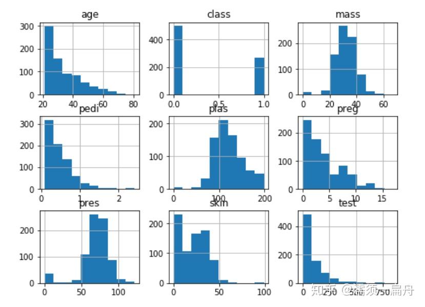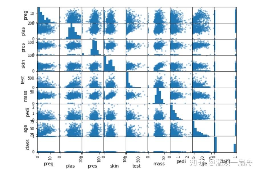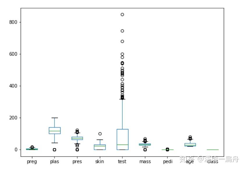 # Load CSV using Pandas from URL import pandas # 导入pandas库 url = "https://raw.githubusercontent.com/jbrownlee/Datasets/master/pima-indians-diabetes.data.csv" names = [\'preg\', \'plas\', \'pres\', \'skin\', \'test\', \'mass\', \'pedi\', \'age\', \'class\'] data = pandas.read_csv(url, names=names) # 读取数据 import matplotlib.pyplot as plt # 导入绘图模块 data.hist() # 直方图 data.plot(kind=\'box\') # 箱图 pd.plotting.scatter_matrix(data) # 矩阵散点图 plt.show() # 展示图表