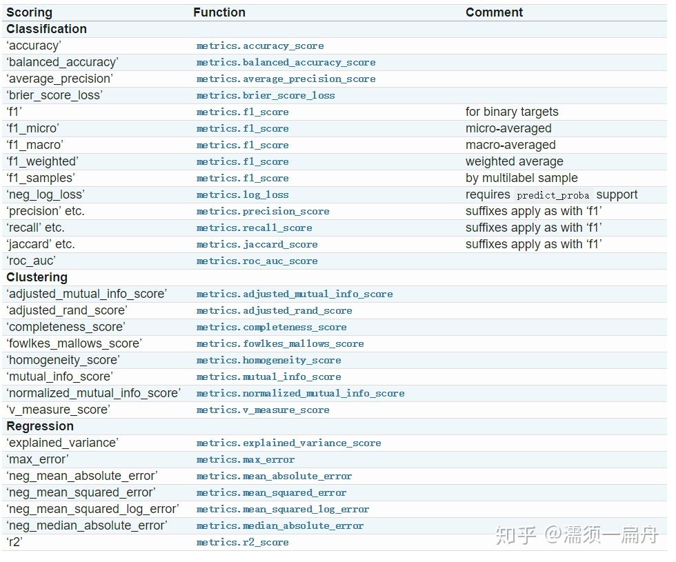 最后要通过某种评估规则计算出模型准确度的分数,这里提供了cross_val_score(scoring=\'\')函数评估交叉验证结果,其中参数scoring代表评估规则。评估规则有很多种,针对回归和分类,有不同的选择,比如: