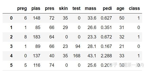 # Load CSV using Pandas from URL import pandas # 导入pandas库 url = "https://raw.githubusercontent.com/jbrownlee/Datasets/master/pima-indians-diabetes.data.csv" names = [\'preg\', \'plas\', \'pres\', \'skin\', \'test\', \'mass\', \'pedi\', \'age\', \'class\'] data = pandas.read_csv(url, names=names) # 读取数据 print(data.head(5)) # 打印数据集前5行
