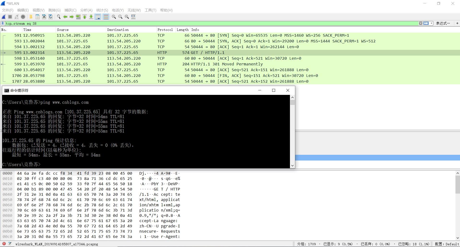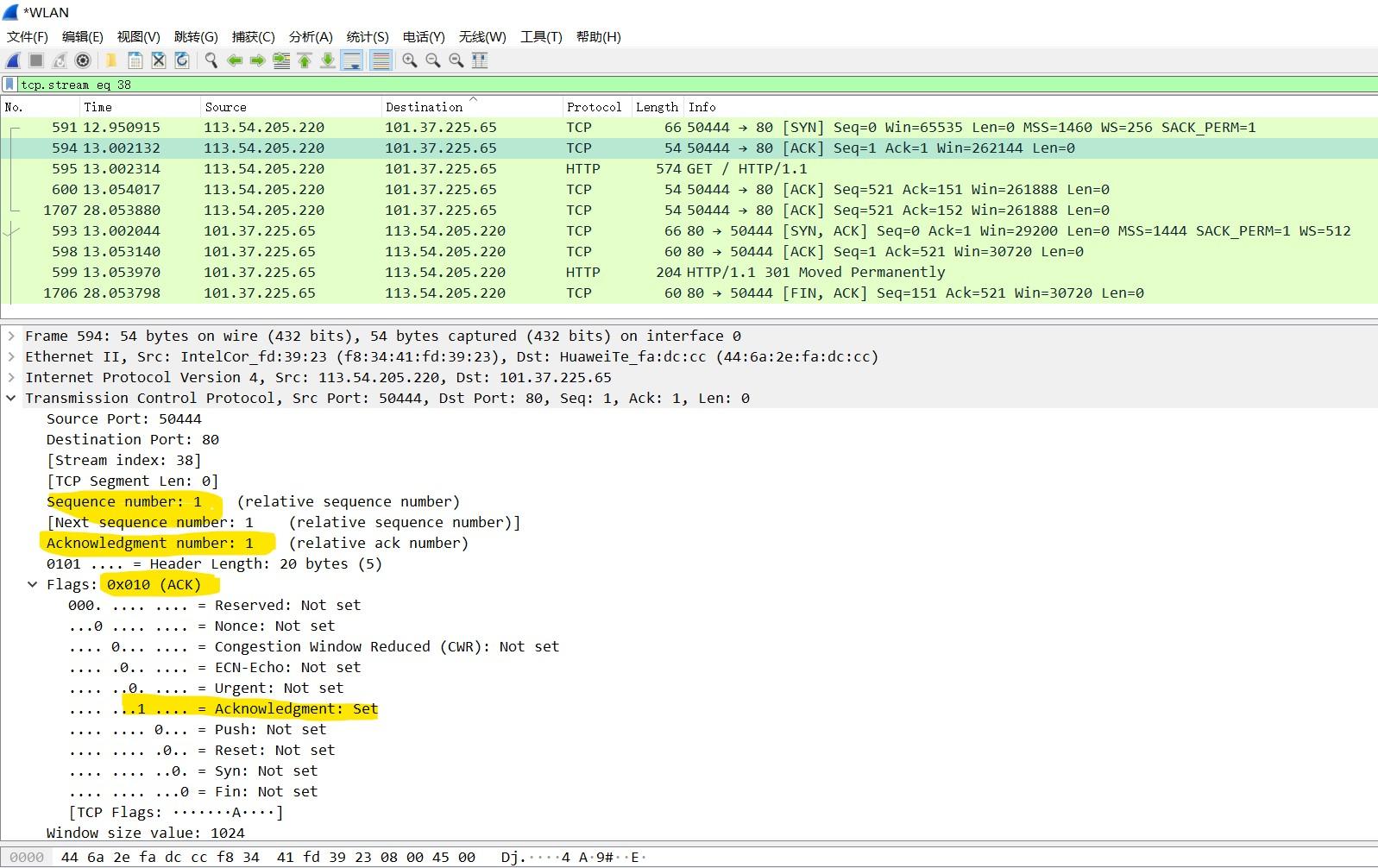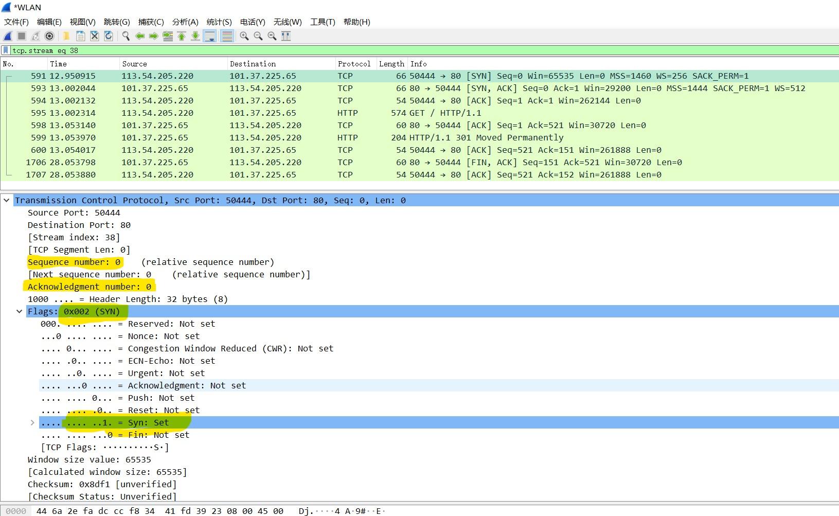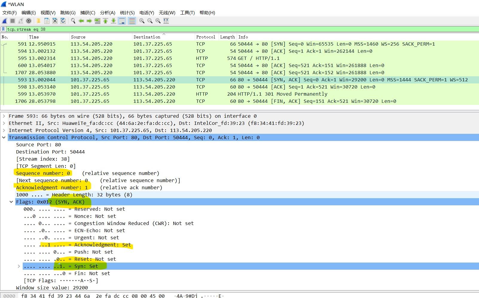 - 隐藏其他无关http数据包,右键选中,追踪流——>TCP流,显示握手信息,如图所示: