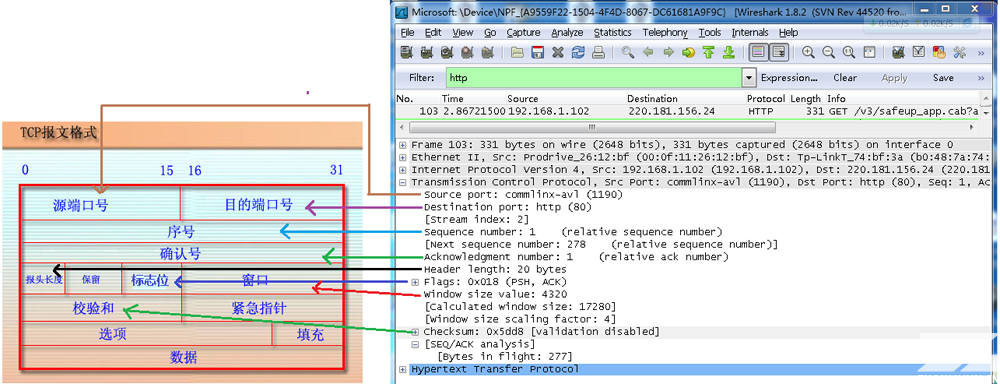 从下图可以看到wireshark捕获到的TCP包中的每个字段。