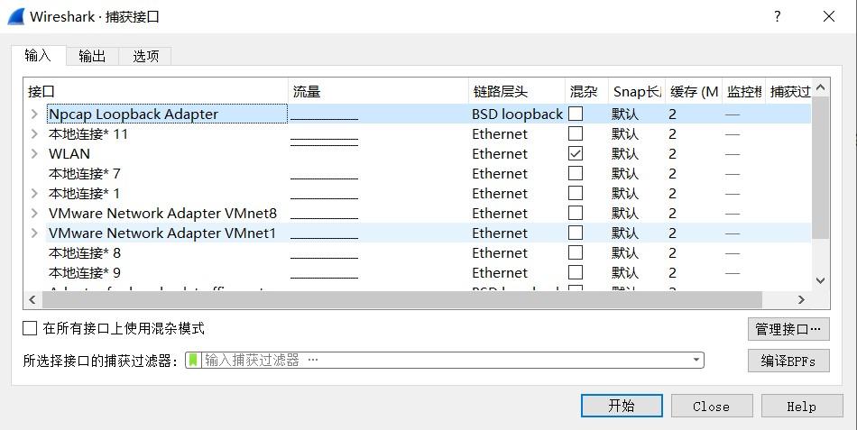 2. 选择菜单栏上捕获——>选项,,取消混杂模式,勾选WLAN,开始(你也可以直接双击上图的WLAN开始)