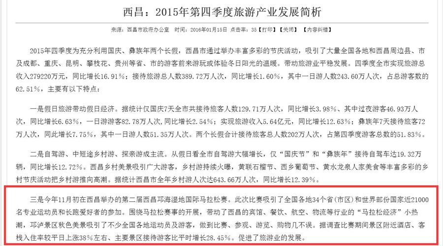 从政府公布西昌2015第四季度旅游数据可以看到,马拉松赛事期间,西昌酒店、客栈入住率较平日上涨38%左右、主要景区接待游客比平时增长28.45%,这些都将直接转换为地方政府的实际旅游收益。