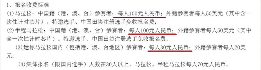 分别为:全马100RMB/人、半马100RMB/人、迷你马30RMB/人;