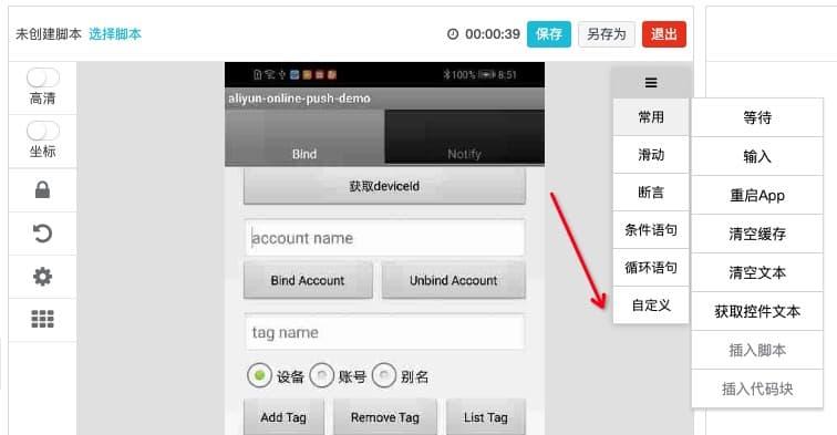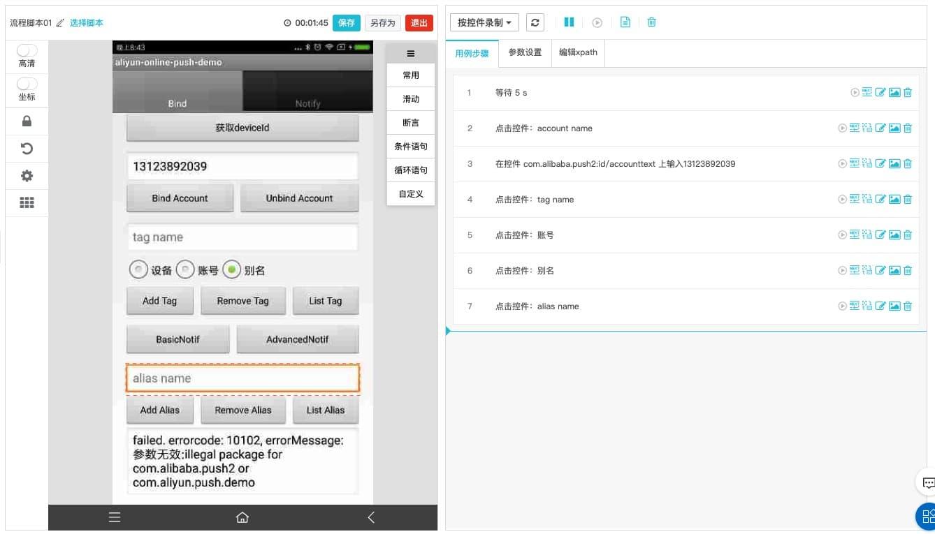 【图3】在线录制脚本-左侧是APP页面,右侧是录制的步骤