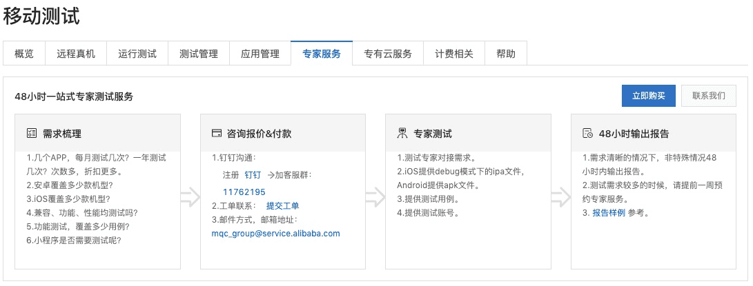 私有部署的 EMAS 移动测试平台,侧重在功能场景的覆盖,但是由于机型有限,也不太可能同时购买几百款机型。为了解决机型覆盖兼容的问题,阿里云 EMAS 提供了一站式48小时的专家测试服务,可以覆盖安卓Top 600款机型,iOS top 70款项机型。