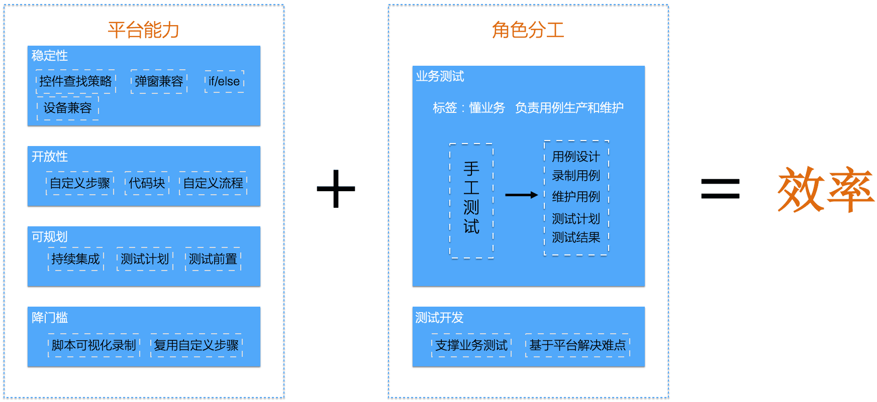 传统手工测试方式,主要依靠个人的主观能动性和过往的经验积累,实际测试过程中,一些成功的测试用例场景、测试方法缺乏沉淀,难以完成从“个人能力”到“组织能力”的升华,进而无法完成组织效能的跃升。