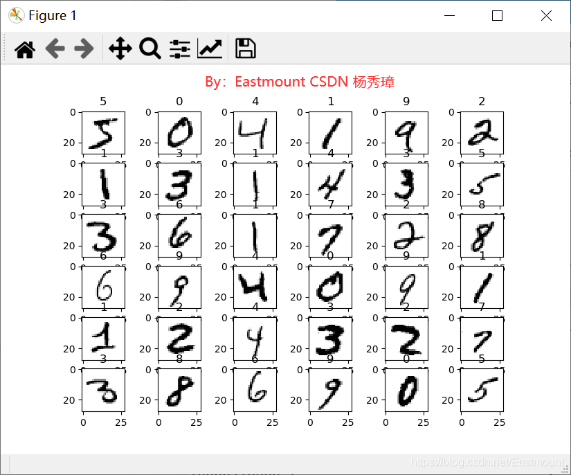# -*- coding: utf-8 -*- """ Created on Fri Feb 14 16:43:21 2020 @author: Eastmount CSDN YXZ O(∩_∩)O Wuhan Fighting!!! """ import numpy as np from keras.datasets import mnist from keras.utils import np_utils from keras.models import Sequential from keras.layers import Dense, Activation from keras.optimizers import RMSprop import matplotlib.pyplot as plt from PIL import Image #---------------------------载入数据及预处理--------------------------- # 下载MNIST数据 # X shape(60000, 28*28) y shape(10000, ) (X_train, y_train), (X_test, y_test) = mnist.load_data() #------------------------------显示图片------------------------------ def show_mnist(train_image, train_labels): n = 6 m = 6 fig = plt.figure() for i in range(n): for j in range(m): plt.subplot(n,m,i*n+j+1) index = i * n + j #当前图片的标号 img_array = train_image[index] img = Image.fromarray(img_array) plt.title(train_labels[index]) plt.imshow(img, cmap=\'Greys\') plt.show() show_mnist(X_train, y_train) # 数据预处理 X_train = X_train.reshape(X_train.shape[0], -1) / 255 # normalize X_test = X_test.reshape(X_test.shape[0], -1) / 255 # normalize # 将类向量转化为类矩阵 数字 5 转换为 0 0 0 0 0 1 0 0 0 0 矩阵 y_train = np_utils.to_categorical(y_train, num_classes=10) y_test = np_utils.to_categorical(y_test, num_classes=10) #---------------------------创建神经网络层--------------------------- # Another way to build your neural net model = Sequential([ Dense(32, input_dim=784), # 输入值784(28*28) => 输出值32 Activation(\'relu\'), # 激励函数 转换成非线性数据 Dense(10), # 输出为10个单位的结果 Activation(\'softmax\') # 激励函数 调用softmax进行分类 ]) # Another way to define your optimizer rmsprop = RMSprop(lr=0.001, rho=0.9, epsilon=1e-08, decay=0.0) #学习率lr # We add metrics to get more results you want to see # 激活神经网络 model.compile( optimizer = rmsprop, # 加速神经网络 loss = \'categorical_crossentropy\', # 损失函数 metrics = [\'accuracy\'], # 计算误差或准确率 ) #------------------------------训练及预测------------------------------ print("Training") model.fit(X_train, y_train, nb_epoch=2, batch_size=32) # 训练次数及每批训练大小 print("Testing") loss, accuracy = model.evaluate(X_test, y_test) print("loss:", loss) print("accuracy:", accuracy)