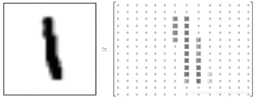如下图所示,它表示由2828的像素点矩阵组成的一张图片,这里的数字784(2828)如果放在我们的神经网络中,它就是x输入的大小,其对应的矩阵如下图所示,类标label为1。