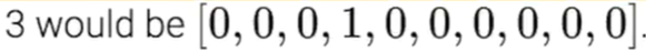 这里的y值其实是一个矩阵,这个矩阵有10个位置,如果它是1的话,它在1的位置(第2个数字)上写1,其他地方写0;如果它是2的话,它在2的位置(第3个数字)上写1,其他位置为0。通过这种方式对不同位置的数字进行分类,例如用[0,0,0,1,0,0,0,0,0,0]来表示数字3,如下图所示。