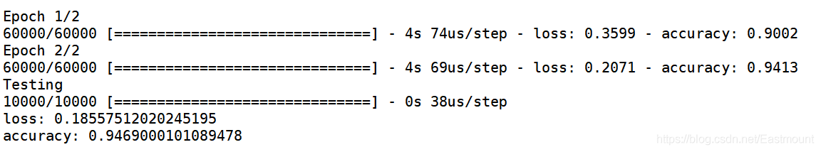 print("Training") model.fit(X_train, y_train, nb_epoch=2, batch_size=32) # 训练次数及每批训练大小 print("Testing") loss, accuracy = model.evaluate(X_test, y_test) print("loss:", loss) print("accuracy:", accuracy)