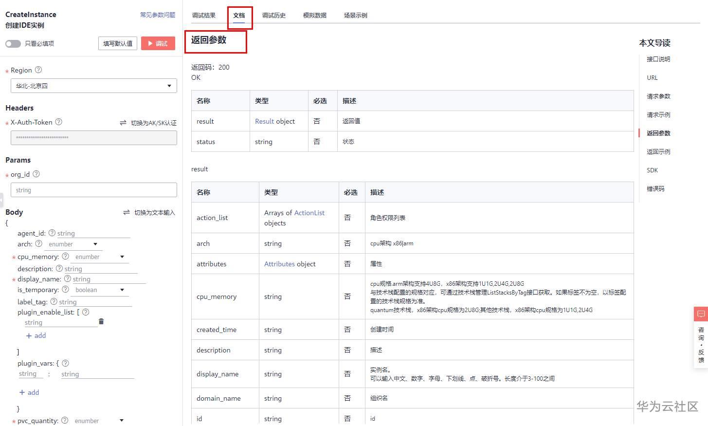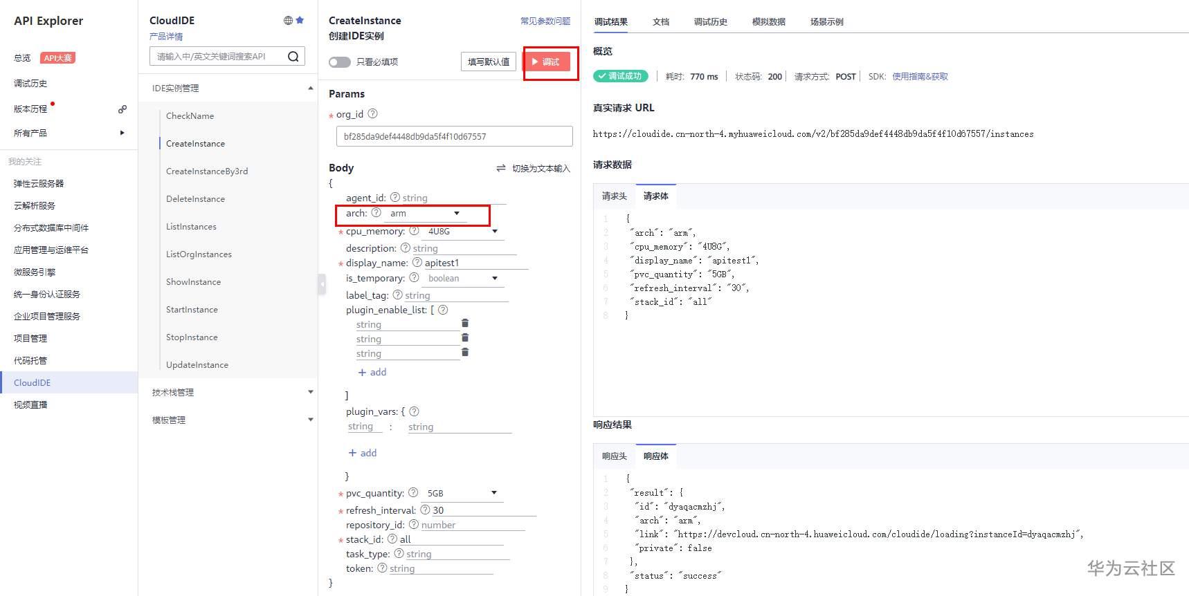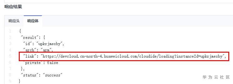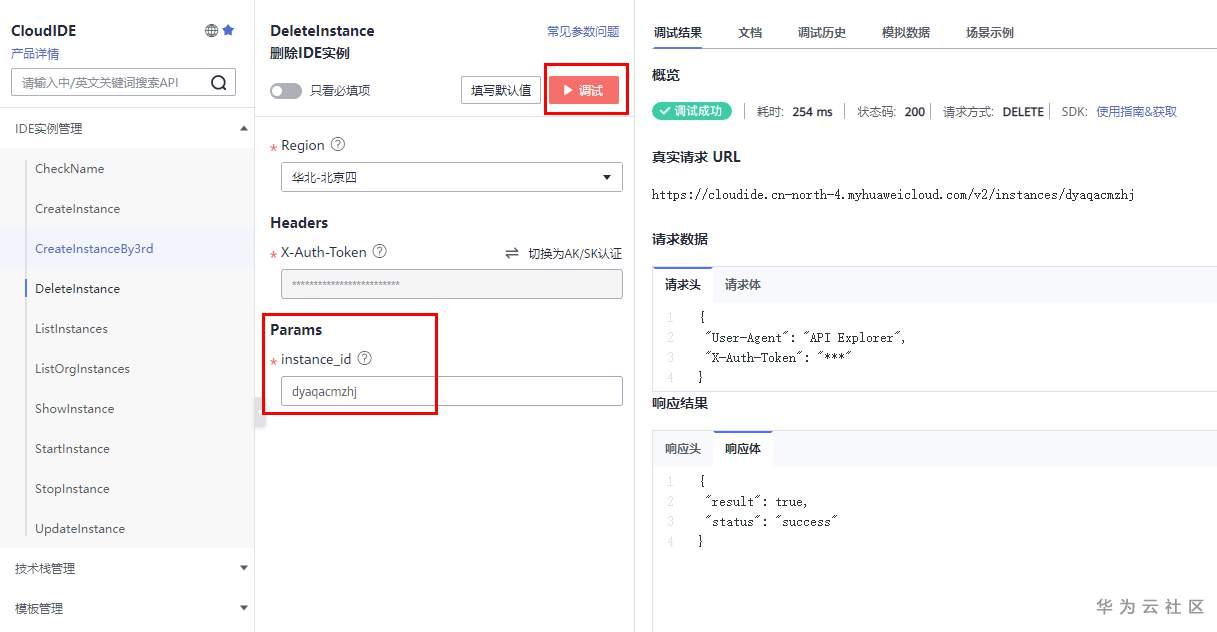 CreateInstance调试成功后,返回的响应体可对照“返回参数”。