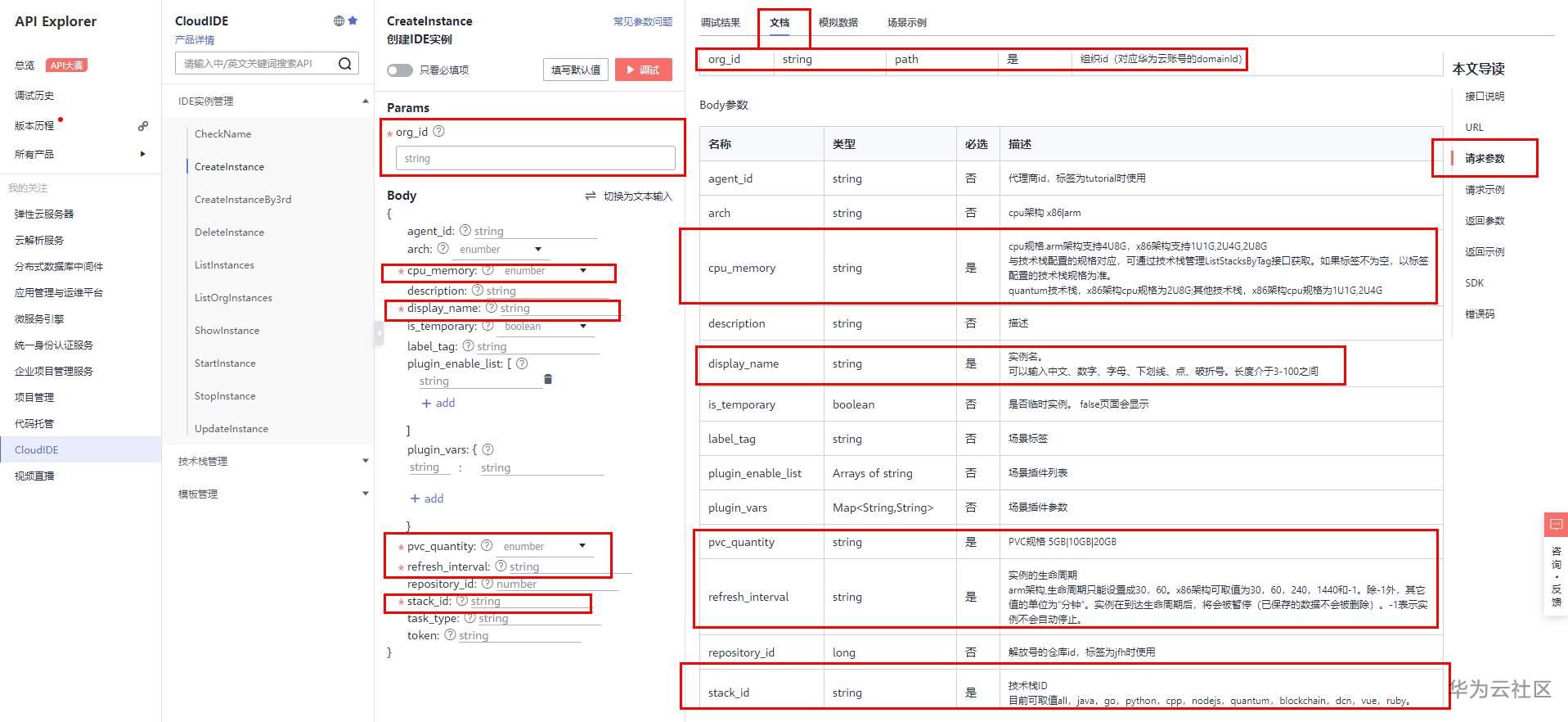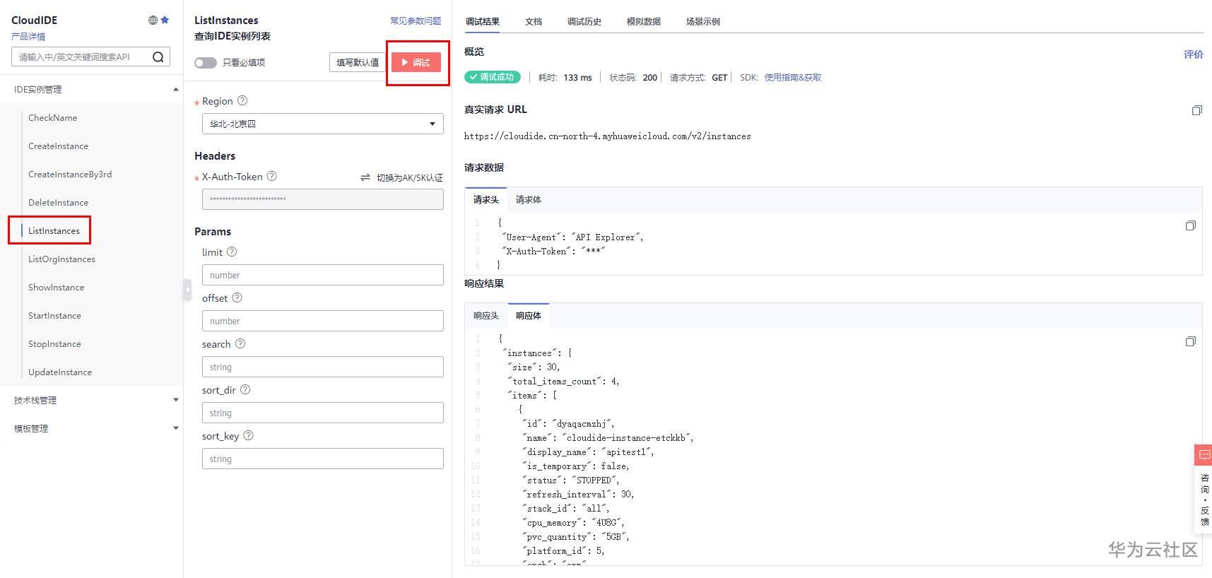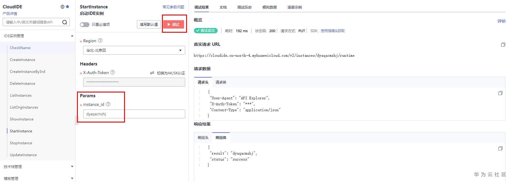 CreateInstance调试成功后,返回的响应体可对照“返回参数”。