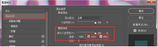 (3)复制上一个图层,点击图层的混合选项——高级混合——通道,只勾选G、B通道,右下方位移;