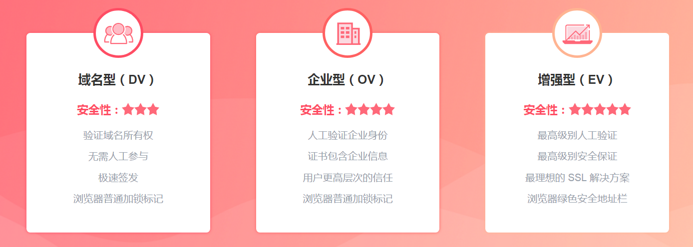 由于本身特性上的差异,免费的 DV SSL 证书与付费的 OV SSL、EV SSL 证书适用于不同场景。