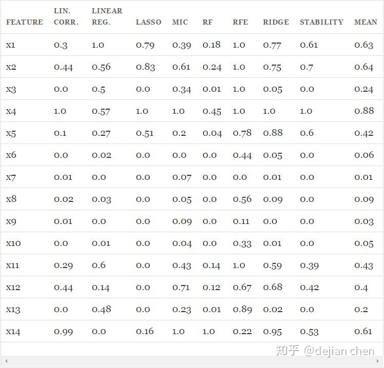 接下来将会在上述数据上运行所有的特征选择方法,并且将每种方法给出的得分进行归一化,让取值都落在0-1之间。对于RFE来说,由于它给出的是顺序而不是得分,我们将最好的5个的得分定为1,其他的特征的得分均匀的分布在0-1之间。