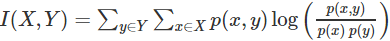 以上就是经典的互信息公式了。想把互信息直接用于特征选择其实不是太方便:1、它不属于度量方式,也没有办法归一化,在不同数据及上的结果无法做比较;2、对于连续变量的计算不是很方便(X和Y都是集合,x,y都是离散的取值),通常变量需要先离散化,而互信息的结果对离散化的方式很敏感。