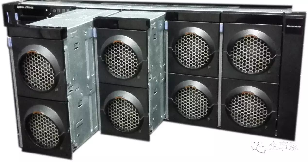 在高端x86服务器中,我们也看到了类似的设计理念,联想System x3850/3950 X6中同样采取了解耦的设计趋向,相比其他大多数厂商4/8路的服务器,X6的设计已经不再是一块大主板的模式,将机箱笼子作为互联核心,电源和I/O模组在后,4/8路独立的处理器内存模块在前,形成3段式结构,实现解耦化的模块设计。
