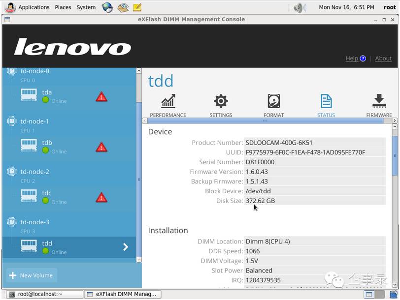 eXFlash DIMM的管理器界面,可以看到4条存储设备的各种信息