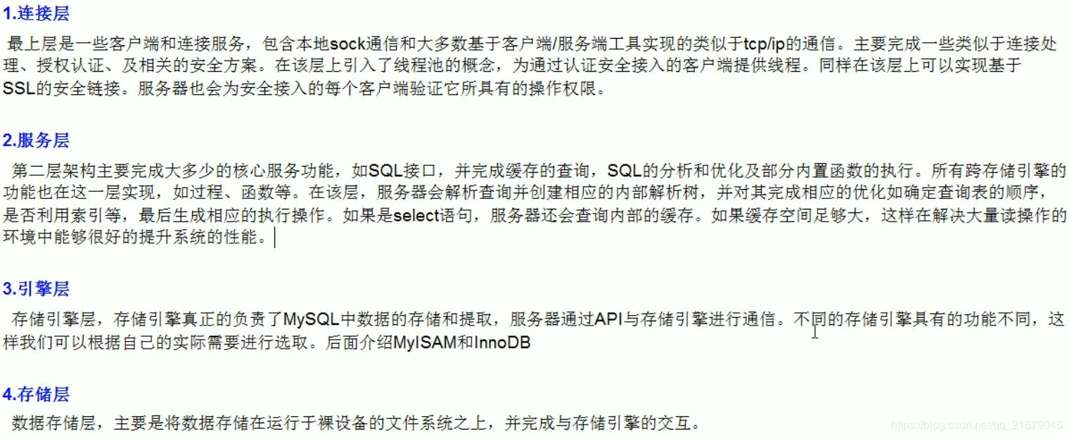 从上到下,连接层,服务层,引擎层,存储层