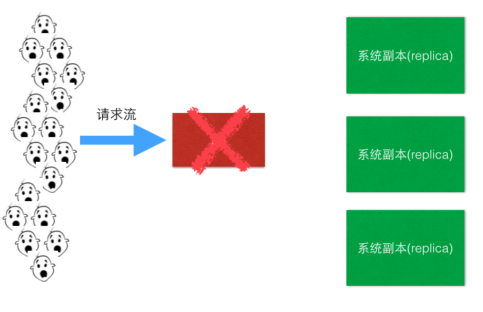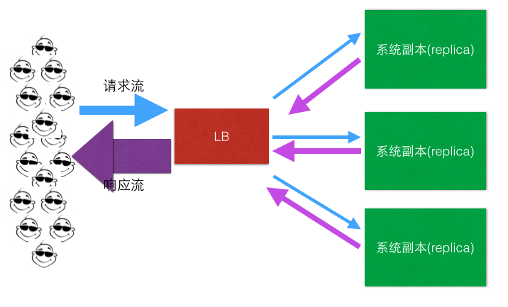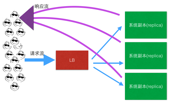 做完上面的垂直拆分之后,可能你会发现还是不行啊,这世界上拥有独特口味的人太多,吃大饼卷牛排的人还是太多了,怎么办? 开分店吧,每个上档次的商场都开一个大饼卷牛排店,这样每个地域的人又被分流到了附近的店。这个提供一模一样服务的“分店”就是系统的副本(Replica),分布式系统中的副本(Replica)除了满足数据冗余,容灾的需要等之外,横向扩展,通过开多个分店(Replica)分流的行为,就是负载均衡,做到多副本之间分流是一个重要的目的。而这个正是本文讨论的范围所在,如下简图: