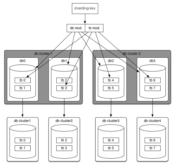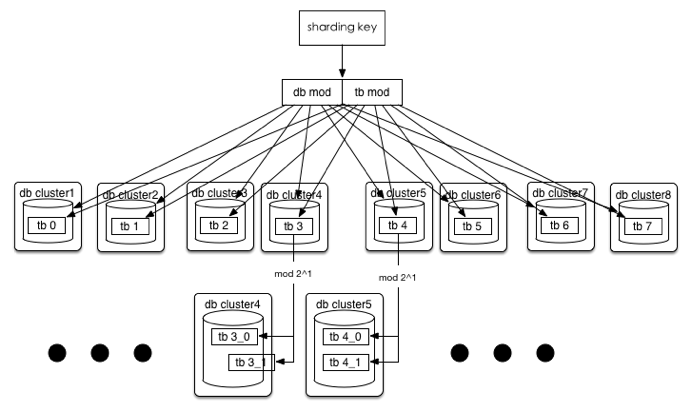 如果32个集群也无法满足需求,那么将分库分表规则调整为(32*2^n)*(32/2^n),可以达到最多1024个集群。