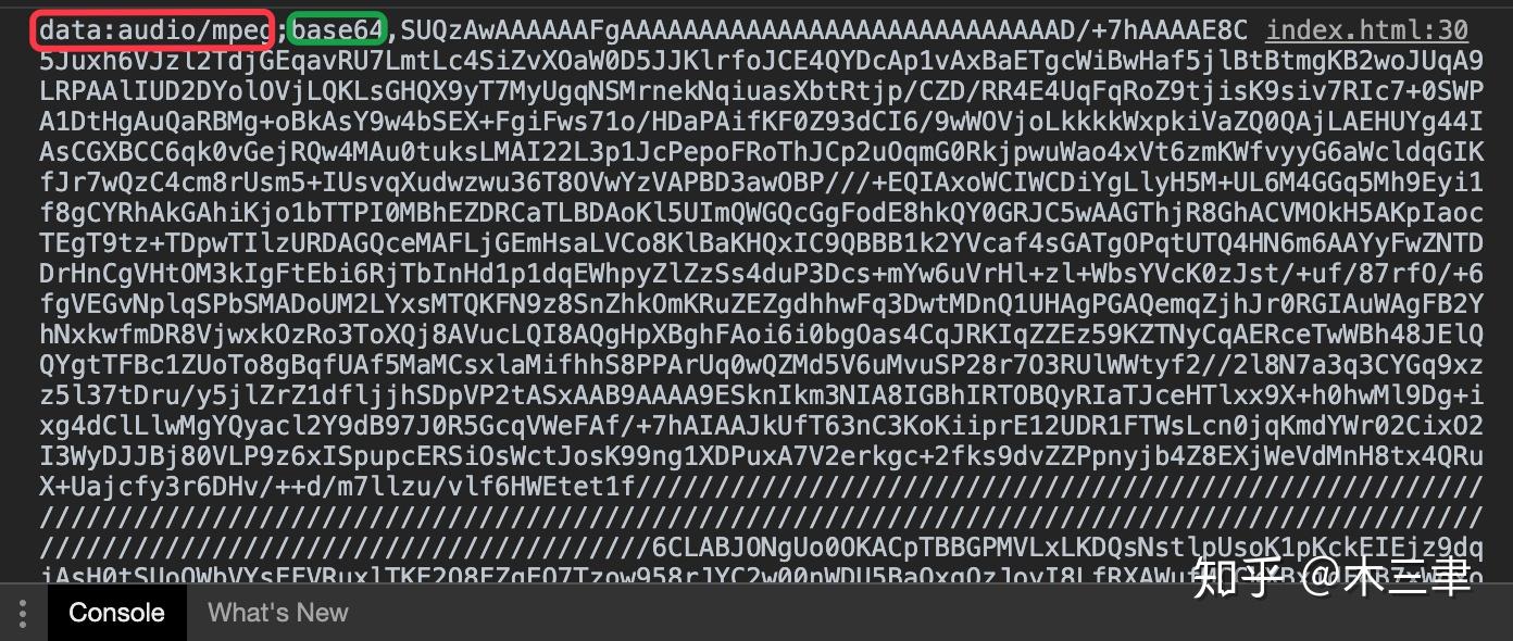 红框告知数据类型,这样audio解码base64后就知道音频格式,就可以正确播放;绿框告知这是base64编码,audio读到这里也会知道使用的是base64而不是其他;绿框后面逗号之后的部分就是完整的base64编码了。如果你的编码没有红框绿框的部分,请自己加上。mp3使用 audio/mpeg,wav使用audio/wav,还可以支持非常非常多格式,其他格式可以上网查找(这里有 https://www.jianshu.com/p/6896ade6299b )。红框绿框之间用英文分号分割,绿框与base64数据之间用逗号分隔。