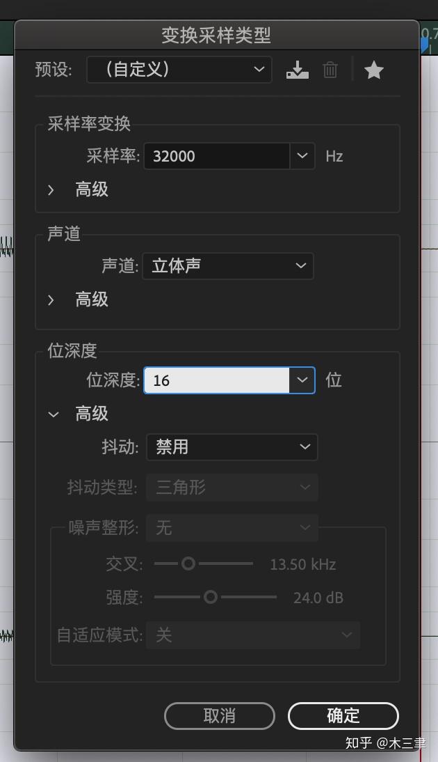 导入音频,变换采样率,16kHz以上都是不必要的,所以直接把采样率改成32kHz,位深度不需要改变,16bit就可以,8bit的量化噪音太大。