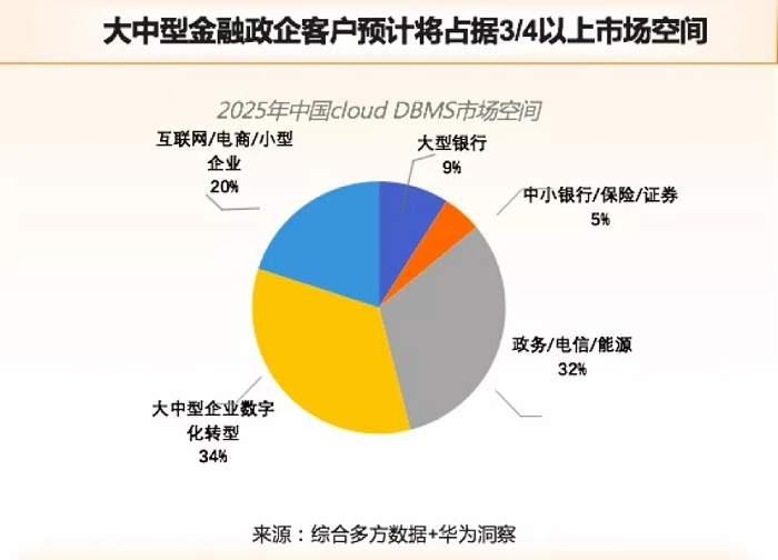 华为预测,大中型金融政企客户在云数据库方面的支出会占到整个中国云数据库市场的3/4,其中OLTP类型数据库市场空间为60%,OLAP为23%,NoSQL为17%。