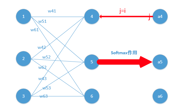 其中y代表我们的真实值,a代表我们softmax求出的值。i代表的是输出结点的标号!在上面例子,i就可以取值为4,5,6三个结点(当然我这里只是为了简单,真实应用中可能有很多结点)