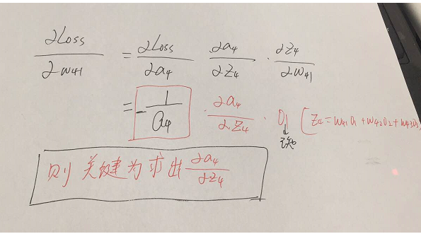 参数的形式在该例子中,总共分为w41,w42,w43,w51,w52,w53,w61,w62,w63.这些,那么比如我要求出w41,w42,w43的偏导,就需要将Loss函数求偏导传到结点4,然后再利用链式法则继续求导即可,举个例子此时求w41的偏导为: