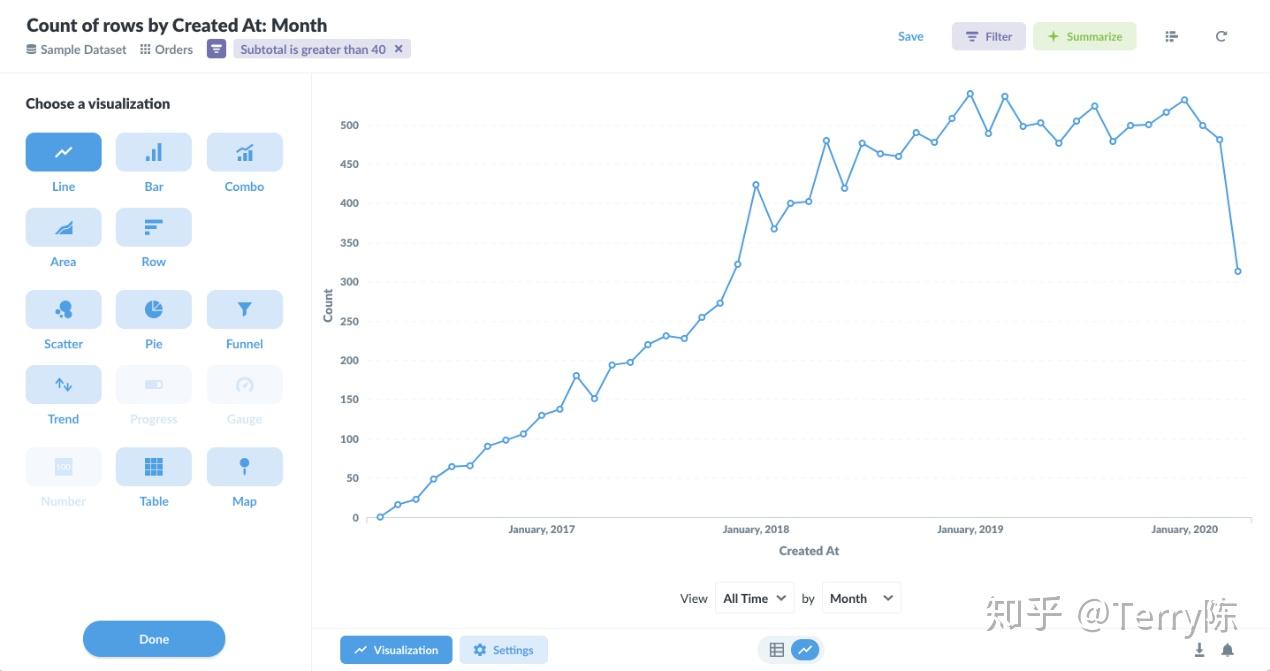 Metabase 目前在 GitHub 上受欢迎程度仅次于 Superset,Metabase 也是一个完整的 BI 平台,但在设计理念上与 Superset 大不相同。Metabase 非常注重非技术人员(如产品经理、市场运营人员)在使用这个工具时的体验,让他们能自由地探索数据,回答自己的问题。而在 Superset 里,非技术人员基本上只能看预先建好的 Dashboard,不懂 SQL 或是数据库结构的他们,很难自己去摸索。
