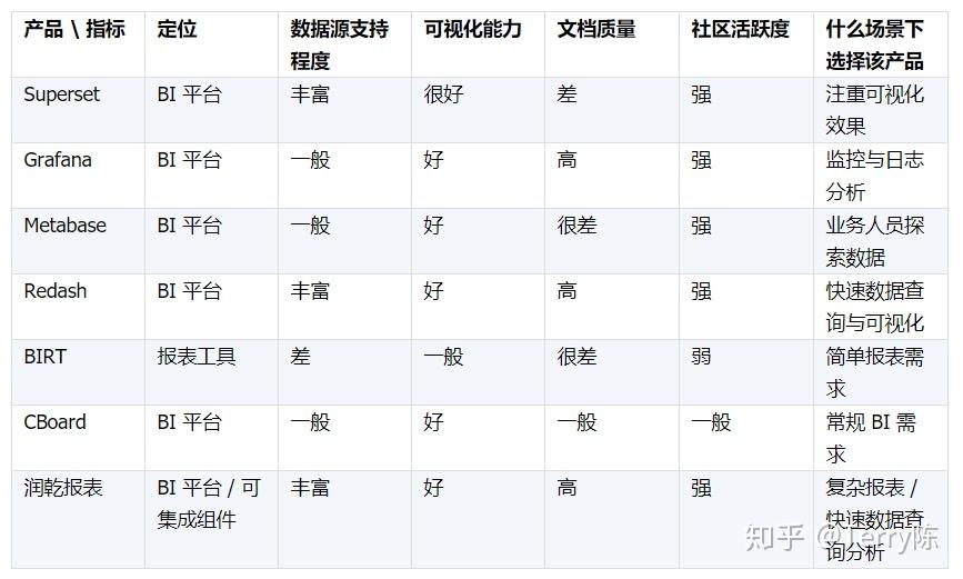 现在市场上开源 BI 产品比较多,各个产品的侧重点不同,有的以报表为主、有的以可视化为主、有的以查询分析为主。这里我们选取了一些主流的开源 BI 产品,从产品功能、可视化能力、数据源支持以及使用文档等方面进行对比,希望对你有帮助。