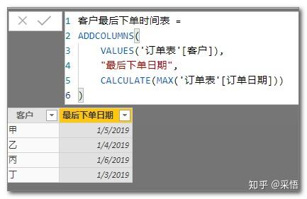其中VALUES(\'订单表\'[客户]),返回客户的不重复列表,就是为了给后面的代码提供上下文,有了这个上下文,后面的代码与新建列的写法是一样的。