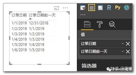 而在度量值中使用列,必须在列上套一个聚合函数,否则不能自动转换为筛选上下文,计算订单日期前一天的度量值应该这样写: