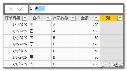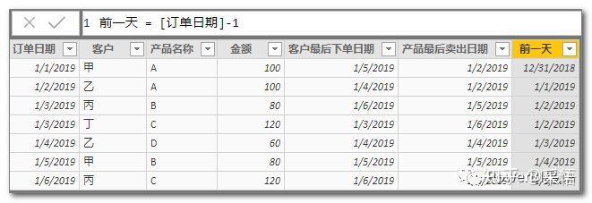 关于计算列和度量值在写法上有一些不同,比如在计算列中使用列,可以直接使用,默认就是该列的当前行,比如返回当前订单日期的前一天,可以直接写: