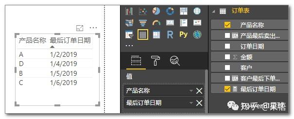 其实度量值的写法可以完全不变,依然可以用上面的代码(MAX(\'订单表\'[订单日期]),只要把表格的维度改为产品名称就可以了,