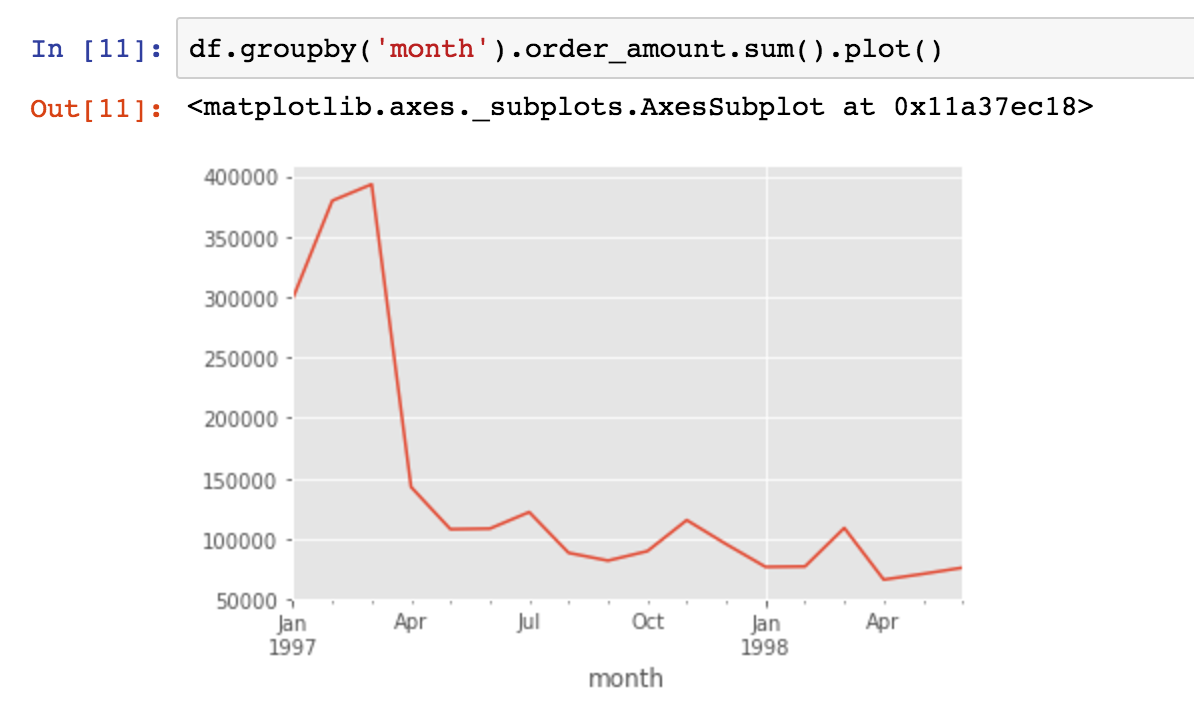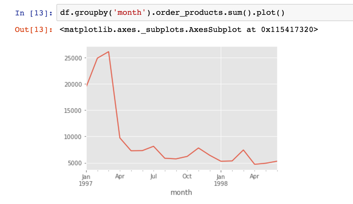 用groupby函数将用户分组,并且求月份的最小值,最小值即用户消费行为中的第一次消费时间。ok,结果出来了,所有用户的第一次消费都集中在前三个月。我们可以这样认为,案例中的订单数据,只是选择了某个时间段消费的用户在18个月内的消费行为。