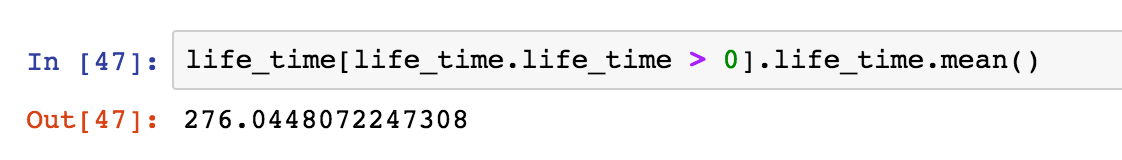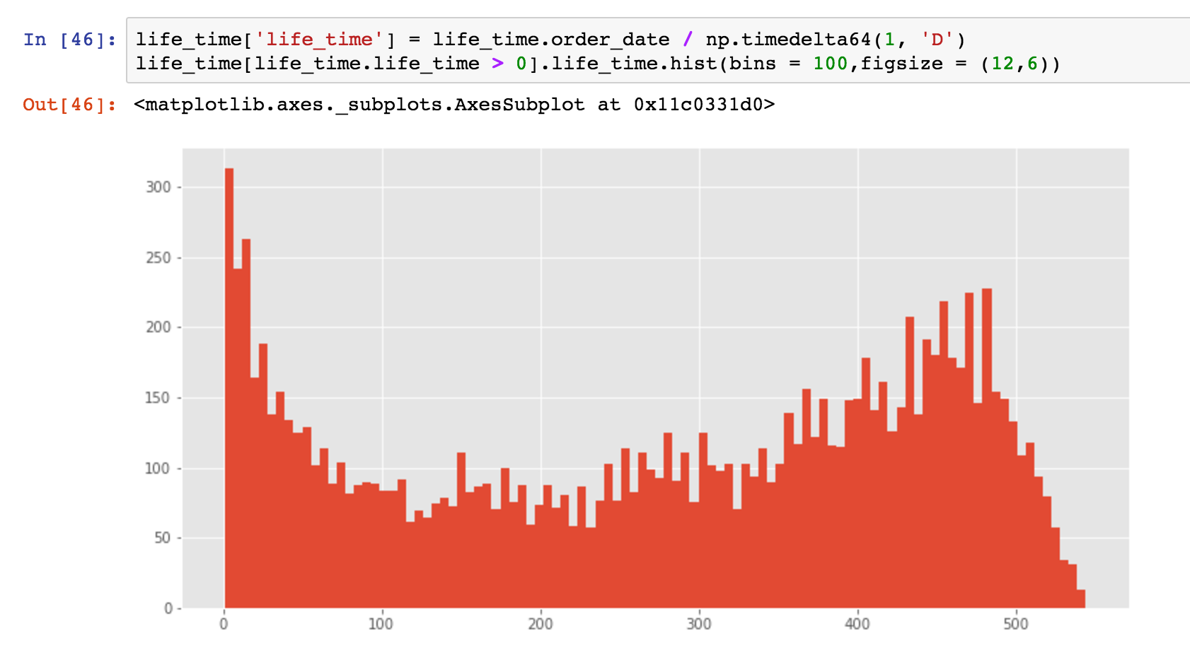 求一下平均,所有用户的平均生命周期是134天,比预想的高,但是平均数不靠谱,还是看一下分布吧,大家有兴趣可以用describe,更详细。