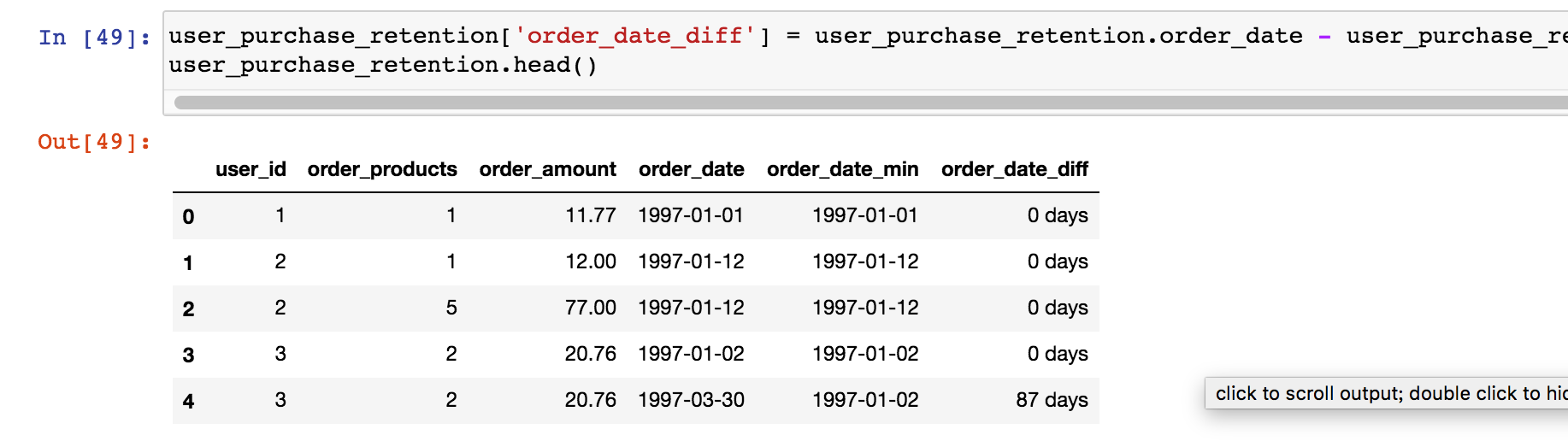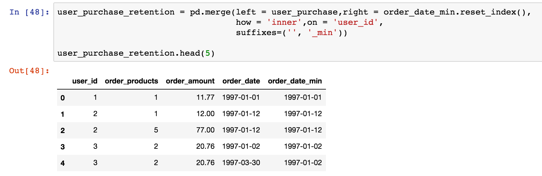 这里用到merge函数,它和SQL中的join差不多,用来将两个DataFrame进行合并。我们选择了inner 的方式,对标inner join。即只合并能对应得上的数据。这里以on=user_id为对应标准。这里merge的目的是将用户消费行为和第一次消费时间对应上,形成一个新的DataFrame。suffxes参数是如果合并的内容中有重名column,加上后缀。除了merge,还有join,concat,用户接近,查看文档即可。