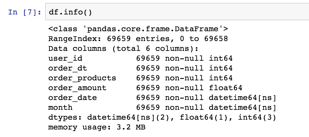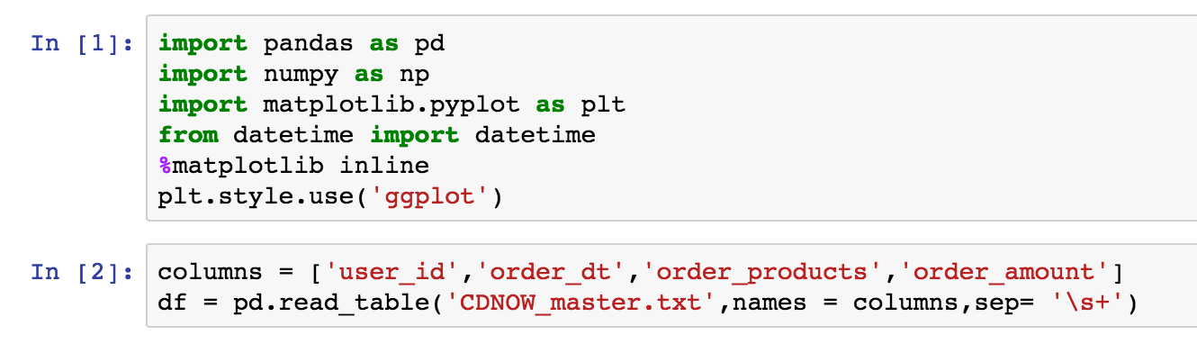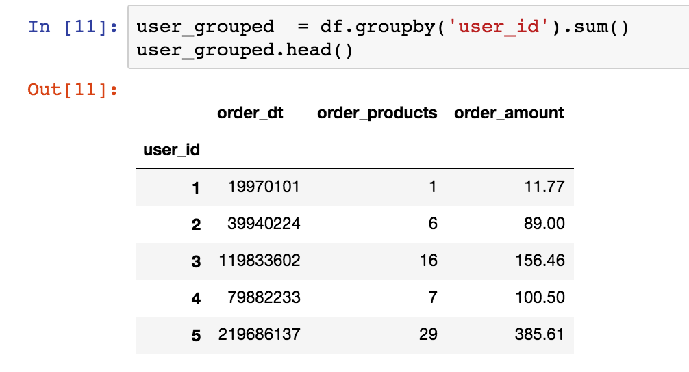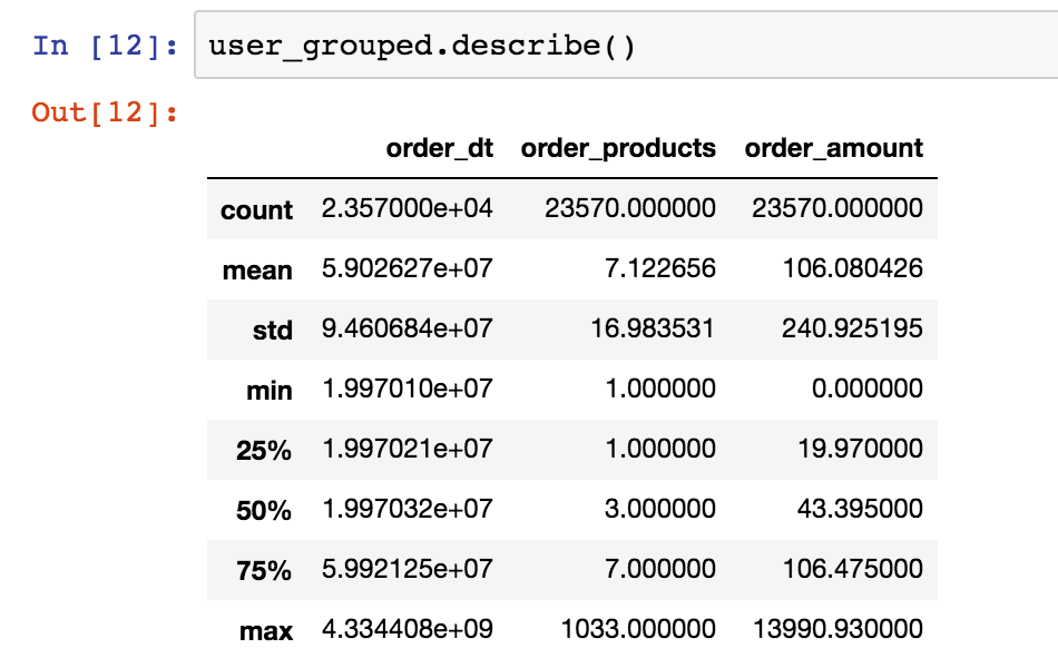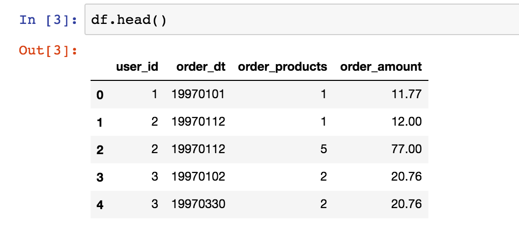 观察数据,order_dt表示时间,但现在它只是年月日组合的一串数字,没有时间含义。购买金额是小数。值得注意的是,一个用户在一天内可能购买多次,用户ID为2的用户就在1月12日买了两次,这个细节不要遗漏。