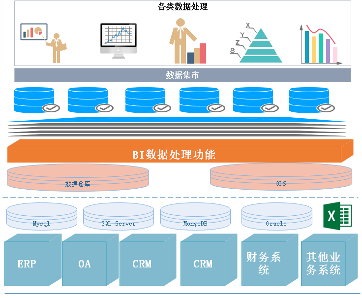 商业智能BI系统的强大,就好比如说Smartbi,可以快速的拉取数据,并且可以以任何的字段作为维度进行筛选整合数据。Smartbi在数据处理的灵活性,是仅次于Excel的,但其又可以处理比Excel更大数据量的数据。换句话说,如果一个企业的数量很小,是不建议上BI软件的。用Excel进行数据处理是很好的选择。当然,想要炫酷的可视化除外。Smartbi在企业上的定位也不同,可以是:报表查询和展现+数据分析挖掘+数据预警+数据管理。