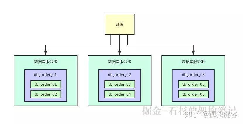 然后每个数据库实例里,都创建一个一样的库,比如说订单库。此时在 5 台服务器上都有一个订单库,名字可以类似为:db_order_01,db_order_02,等等。