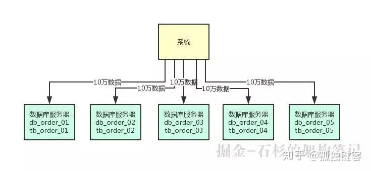 这样就可以把数据均匀分散在 5 台服务器上了,查询的时候,也可以通过订单 id 来 hash 取模,去对应的服务器上的数据库里,从对应的表里查询那条数据出来即可。