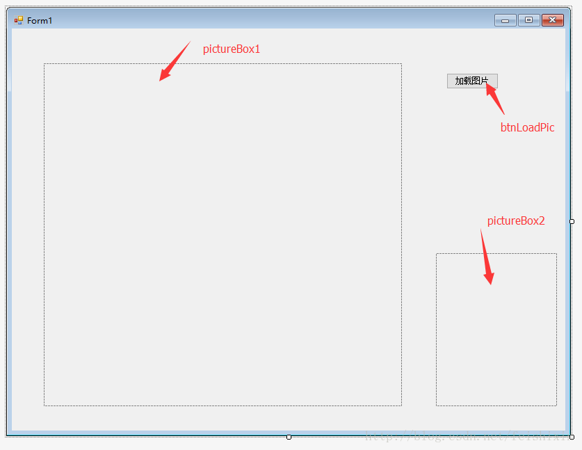 通过设计器和工具箱,我们可以建立我们的视图界面,包括一个按钮两个PictureBox.